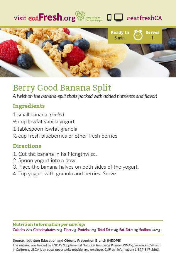 Berry Good Banana Split recipe card with your choice of what is displayed on the reverse side. Options are the default EatFresh.org Mini...