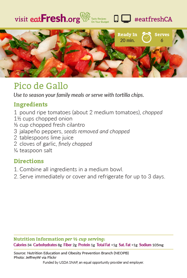 Pico de Gallo recipe card with your choice of what is displayed on the reverse side. Options are the default EatFresh.org Mini Course...
